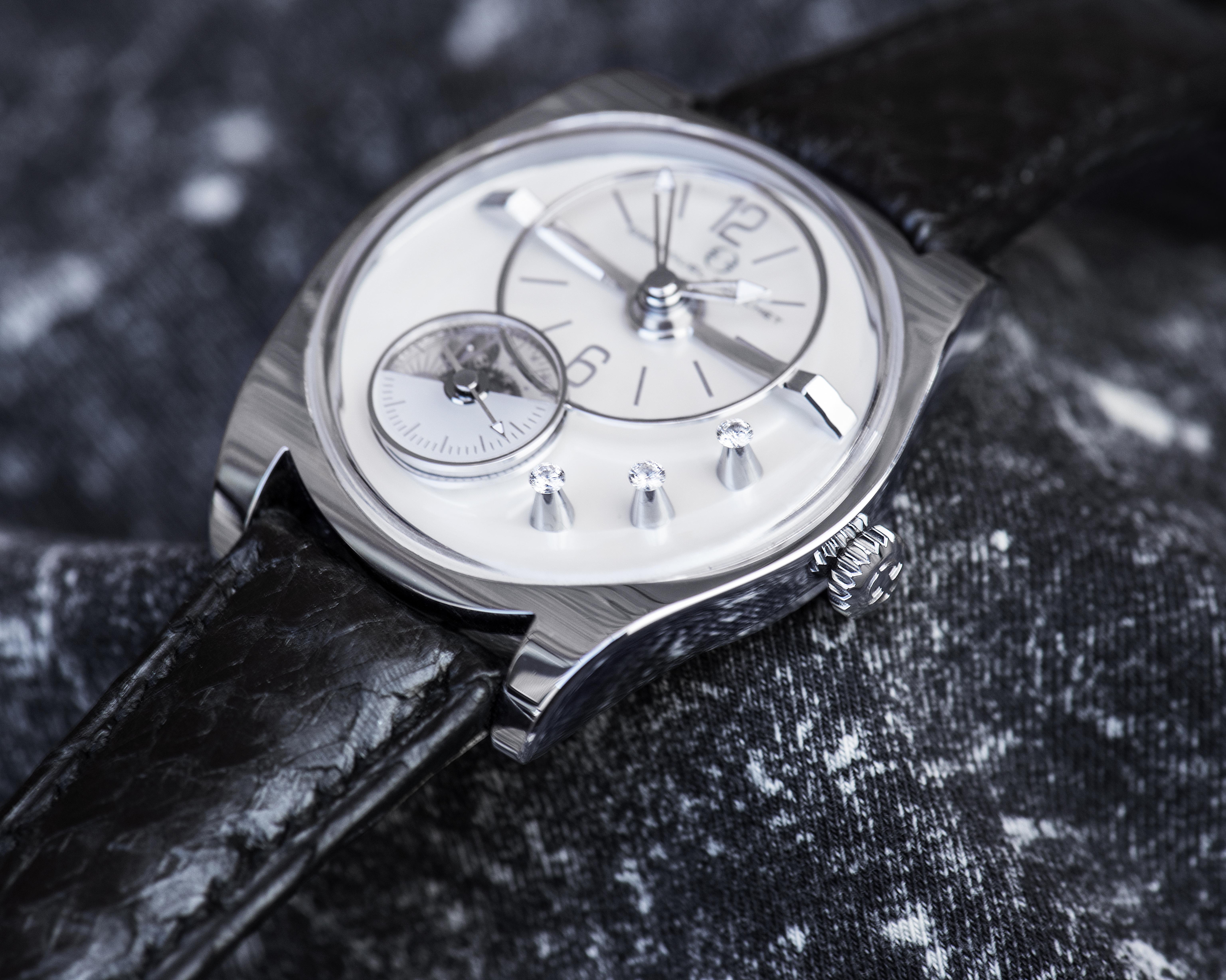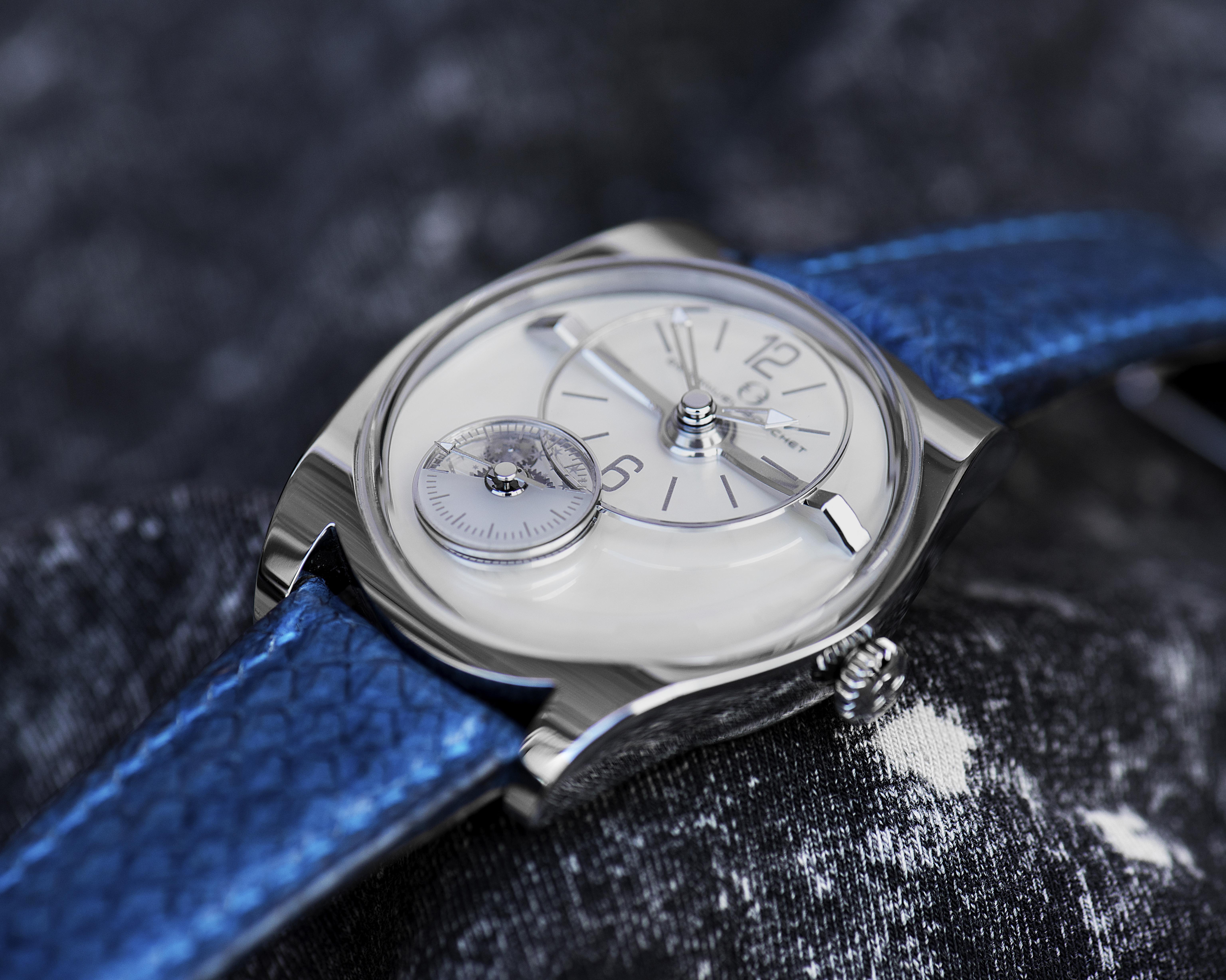 The EB02 Automatic houses the EB89F caliber, the brand’s first automatic micro-rotor caliber from Emmanuel Bouchet. It features slanted seconds on a subdial at 6:00 and offers a day/night indicator, as well as 45 hours of power reserve. Caliber EB89F is designed by Emmanuel Bouchet, created exclusively for this timepiece and is manufactured in Switzerland. The 18-karat white gold version — with diamonds — retails for $57,000, while the non-diamond-set models sell for $49,800. Just 18 pieces of each will be made in rose gold and in white gold.