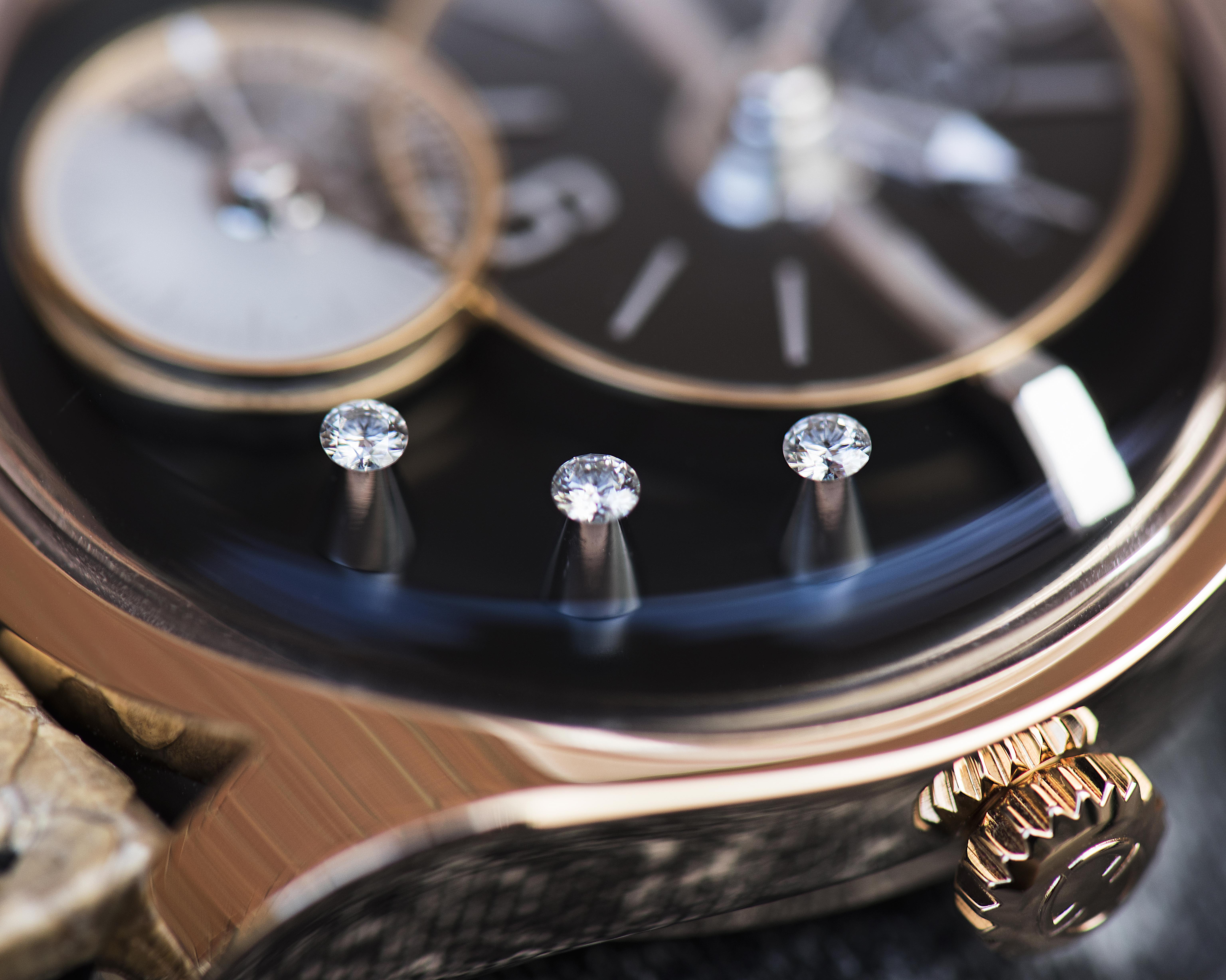 First and foremost is the fact that on the diamond-set version — with three diamonds on the dial — the diamonds are actually not traditionally set wit prongs or claws, but rather are positioned on unique cones floating inside the sapphire crystal dome. The setting has a patent pending.