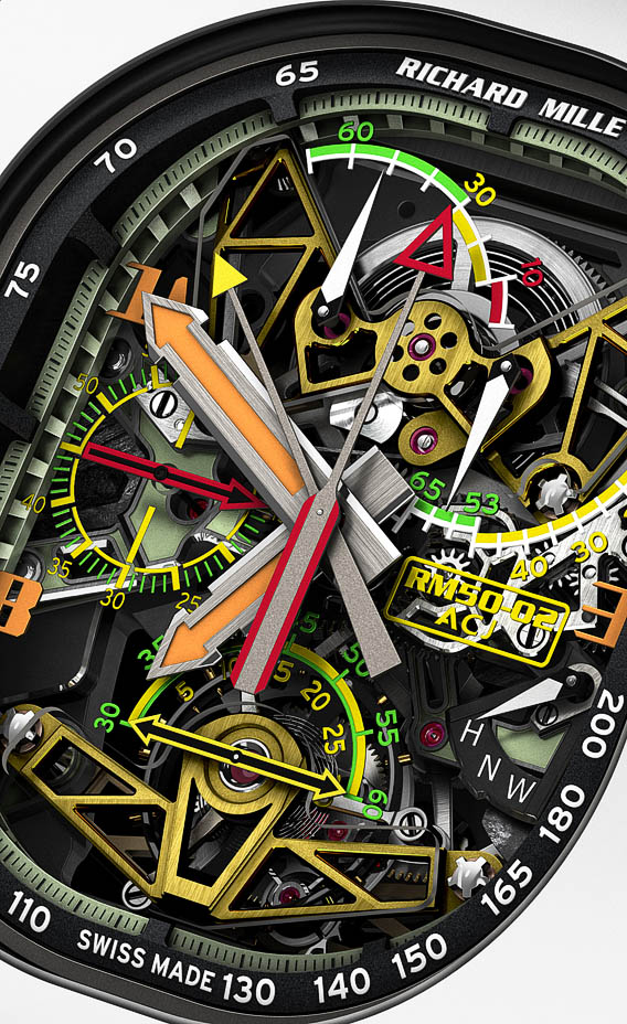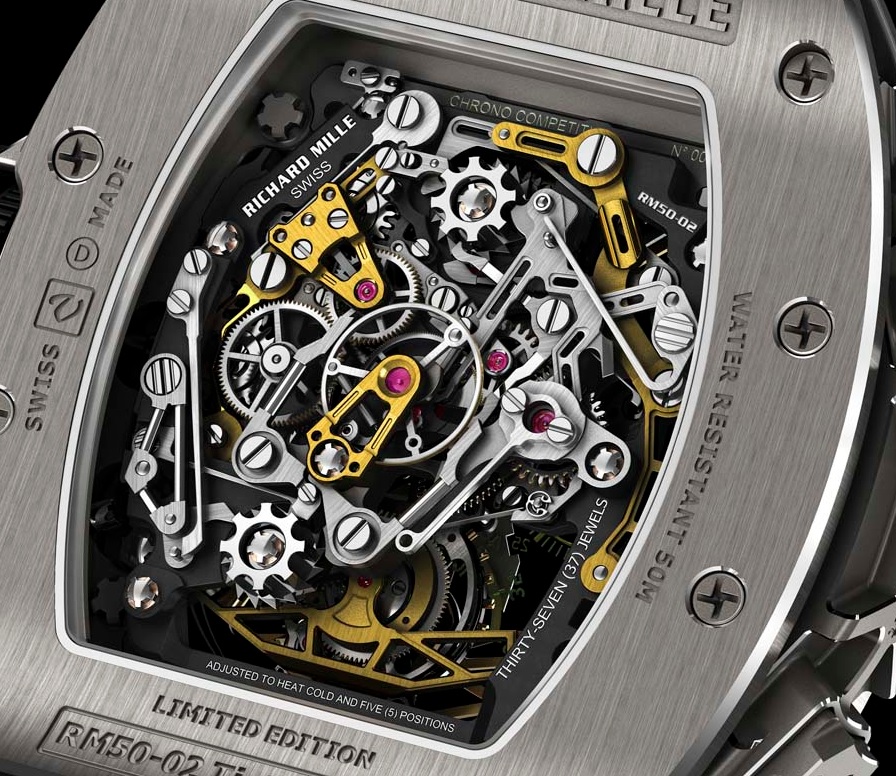 Additionally, the RM 50-02 features some unique aeronautical flare and substance thanks to the partnership. In fact, a number of the internal components have been coated with a chemical typically used to protect jet engines and chassis parts from corrosion and environmental conditions.