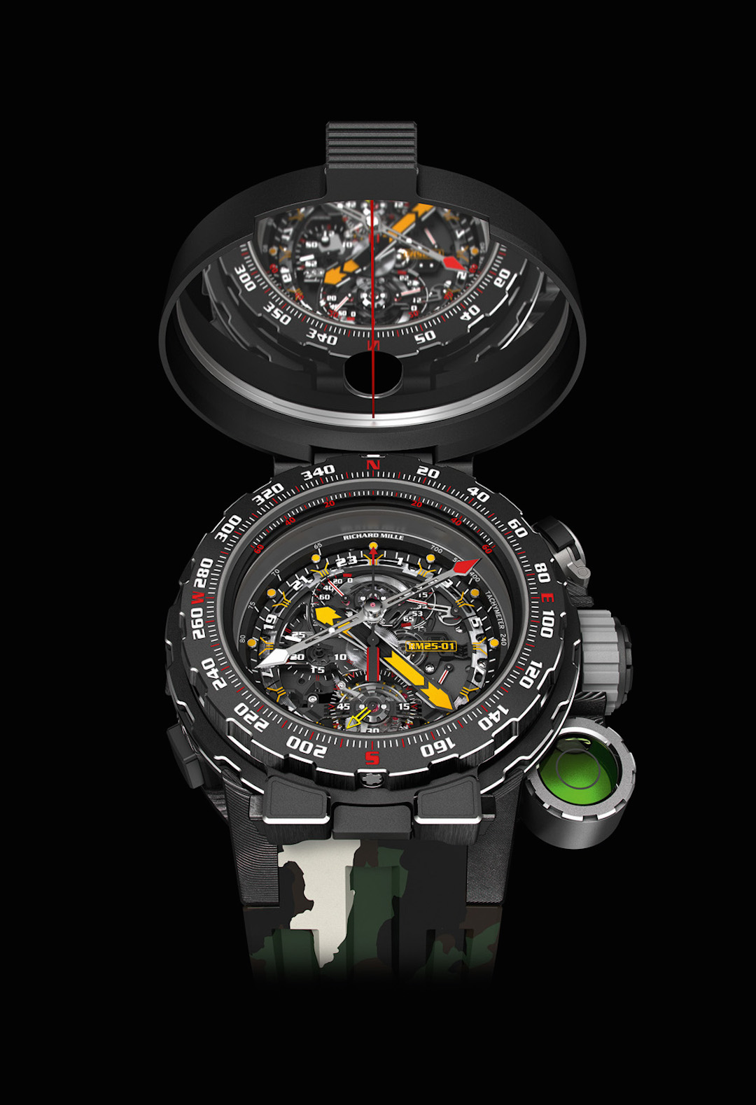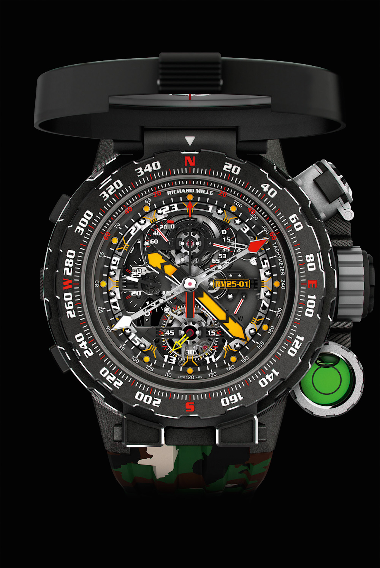 The RM25-01 Tourbillon Adventure watch has some pretty impressive signature features. As its name suggests, it incorporates a tourbillon escapement (to compensate for errors in timekeeping due to the effects of gravity when the watch is in different positions on the wrist), however it also boasts a torque and power reserve indicator, and is offered with two interchangeable Carbon TPT bezels, one bidirectional daytime bezel with 24-hour scale, and a second bezel with cardinal compass points. The compass bezel, complete with lid, is crafted of Grade 5 titanium and equipped with a bayonet mount and a mirrored cover with a slot at 12:00 to improve sighting of the compass needle. Additionally, there is a titanium cased “spirit” level that makes it possible to hold the watch perfectly level – helping with accurate reading of the compass needle.