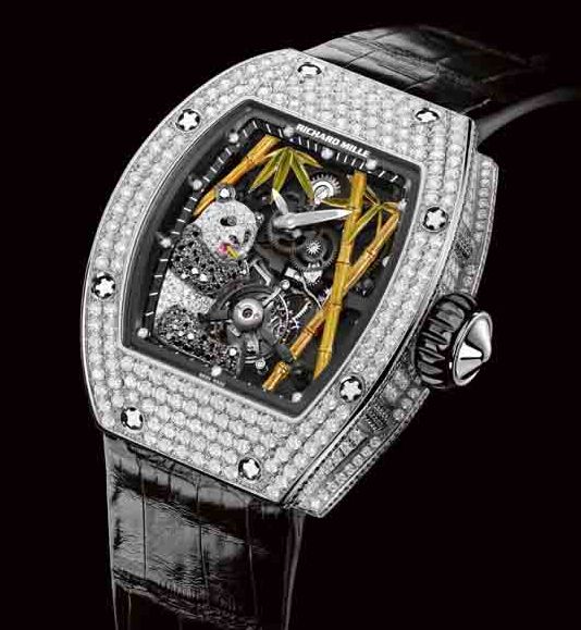 One of the first watchmakers ever to introduce the concept of 3D watches to the world, Richard Mille has done it again with the stunning RM 26-01 Panda high-jeweled watch. In three-dimensional beauty, a giant panda, created in gold with black sapphires and white diamonds, rests among bamboo shoots on the dial of the tourbillon timepiece.