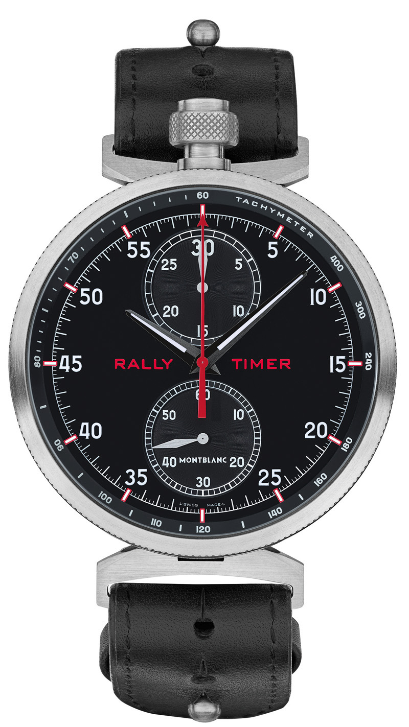 This watch is inspired by the Rally Timer stopwatch produced by Minerva, and in a new twist, this 2017 Montblanc rendition may be converted to a pocket watch by folding the strap attachments under the case and turning the case from 0 to 180 degrees (from 3 to 9 o’clock). The timepiece may then be used traditionally or clipped on a metal plate covered with leather (included with the watch) that attaches to a car dashboard.