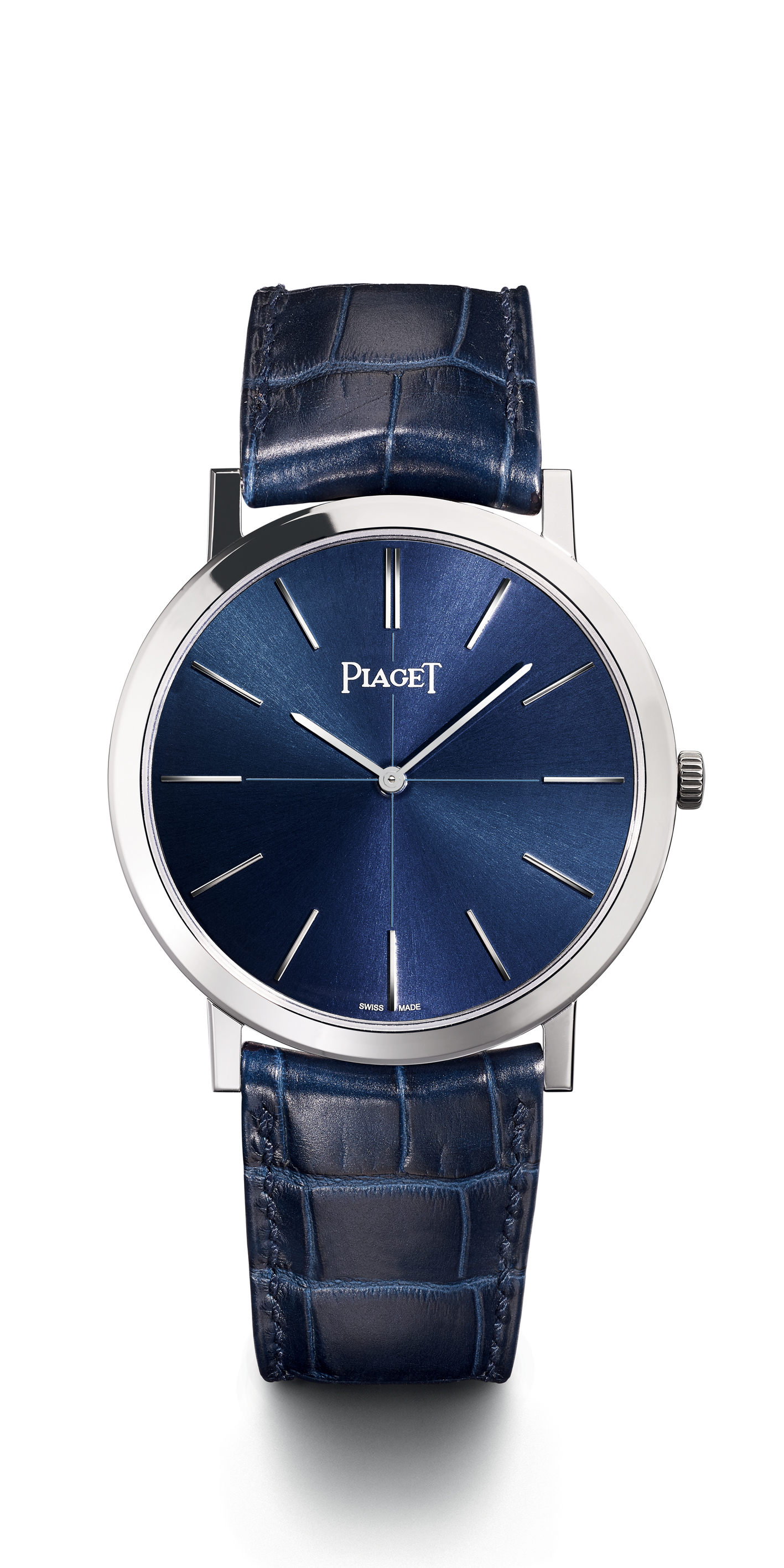 The second watch, also in white gold, measures in at 38mm and is driven by the manually wound Caliber 430P (just 2.1mm thick), which represents the second generation of the brand’s slim hand-wound movements. Functions include hours and minutes. It beats at 21,600 vph, and it has a power reserve of about 43 hours. This Altiplano 60th Anniversary watch is a limited edition of just 460 pieces, and unlike the 43mm timepiece, it has a solid caseback that is engraved with the Piaget coat of arms. It, too, comes on a blue alligator leather strap with a white gold buckle. The watch retails for $17,900.