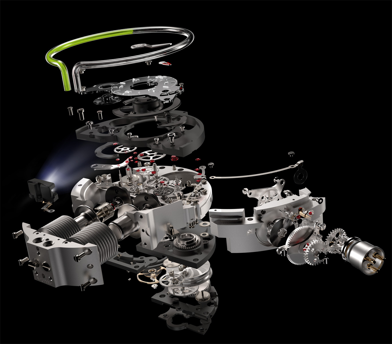 The new H4 Metropolis has the same DNA as its predecessors, and is built on the same chassis as the inaugural H1 release, but with some enhancements. The H4 is meant to be a fully illuminated piece. To do that the watch has been equipped with two LED light sources located discretely at the 6 o’clock position. The push piece between the 4 and 5 o’clock positions activates a generator. The pressure winds the mechanism which in turn powers the two LED lights. The end result is a soft blue light that illuminates the watch. The green liquid used to tell time for the piece will also become iridescent from the LED lights. The charge last for approximately 5 seconds, after which the generator will need to be activated again. The entire process is mechanical, no batteries included or needed.