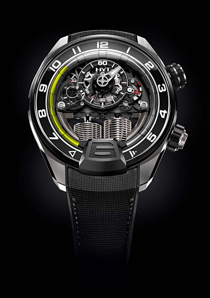 “Be water my friend.” The famous quote comes from Bruce Lee and is meant to drive home the importance of taking on the adaptable properties of liquid as it is able to flow into any shape. This is the first thing I think of whenever we have an opportunity to review a piece by Hydro Mechanical Horologists, HYT. The brand is famous for its work with mechanical timepieces and the incorporation of liquid to help track the passage of time. For those unfamiliar with the brand, HYT uses two billows to move liquid around the face of the watch. A colored liquid is used to indicate the hours and the distance between each hour marker is used to approximate the minutes.