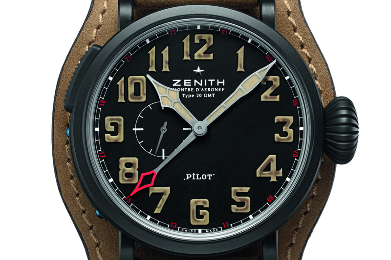By Ryan Walsh If you were to play the game where someone says a word and you have to say the first thing that comes to mind, and if the word you were told was flight or flying… your response may likely be the Wright Brothers. Zenith this year recognizes the achievements the Wright Brothers made in flight and has introduced the Pilot Montre d’ Aeronef Type 20 GMT 1903. Much like on an aircraft, a good instrument watch does not need extra weight, so, to lighten the load, Zenith created the Pilot Montre d’ Aeronef Type 20 GMT 1903 in a case made of black DLC coated titanium. Even with a 48mm diameter, the watch is surprisingly light weight. With controls needed on the fly, literally, the ratcheted crown on the Type 20 is a throwback to the old aviator watches, making it easier for pilots then to use with gloves on.