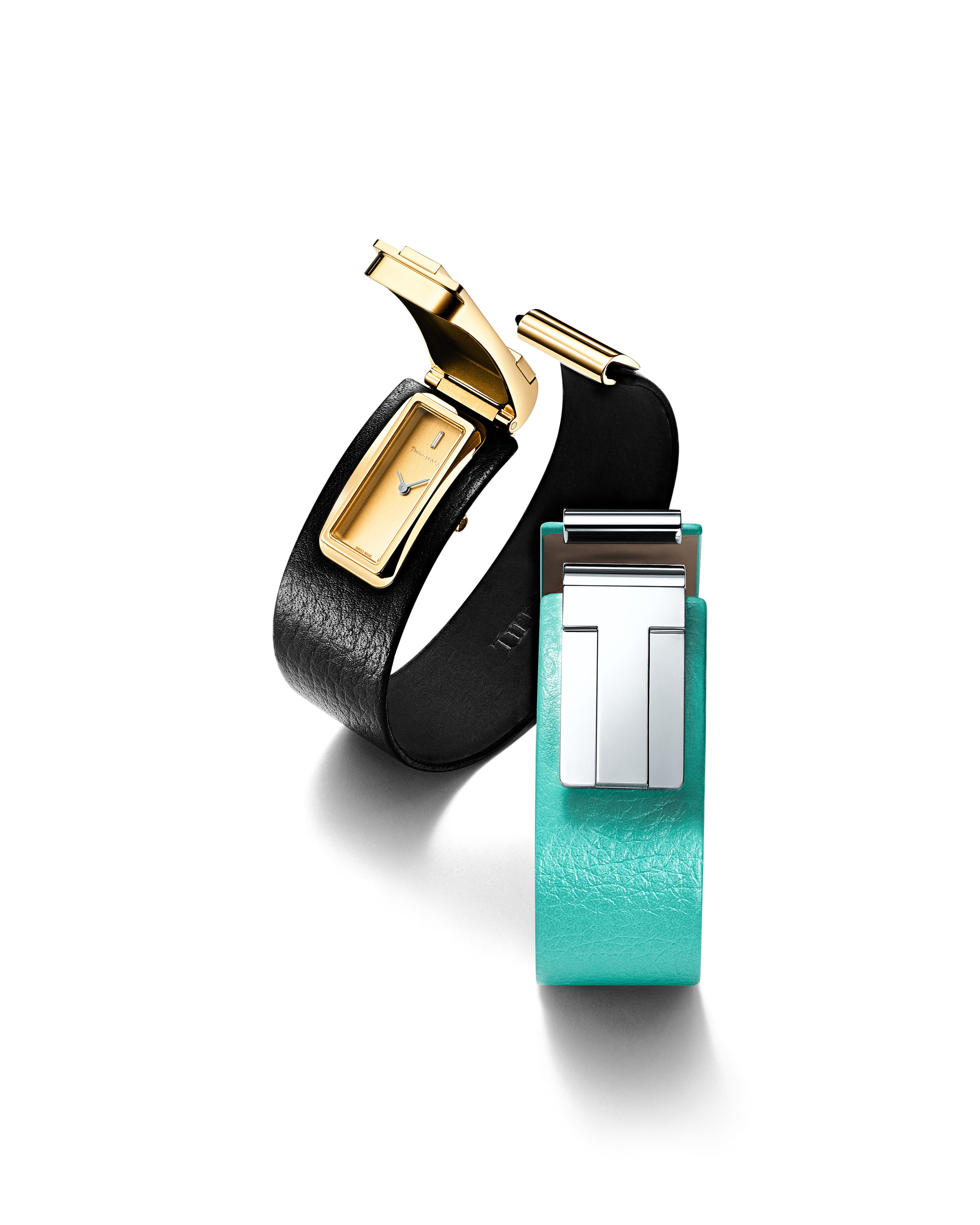 Tiffany & Co. is all about icons. Now, not long after the brand opened its new cafe at the New York flagship store, it is unveiling an all new watch: the first-ever Tiffany T watch. The watch is the newest addition to the brand’s iconic Tiffany T collection. It is a secret watch on a leather cuff. At first glance, it looks like the famed T motif as a metal inset on the leather cuff, but on closer look that T opens to reveal the watch dial beneath. The brushed dial is set with a single baguette-cut diamond at 12:00, and with simple baton-shaped hands. It is created in 18-karat yellow gold on a black strap ($8,500), or in sterling silver on either a black or a Tiffany Blue strap for $2,950.