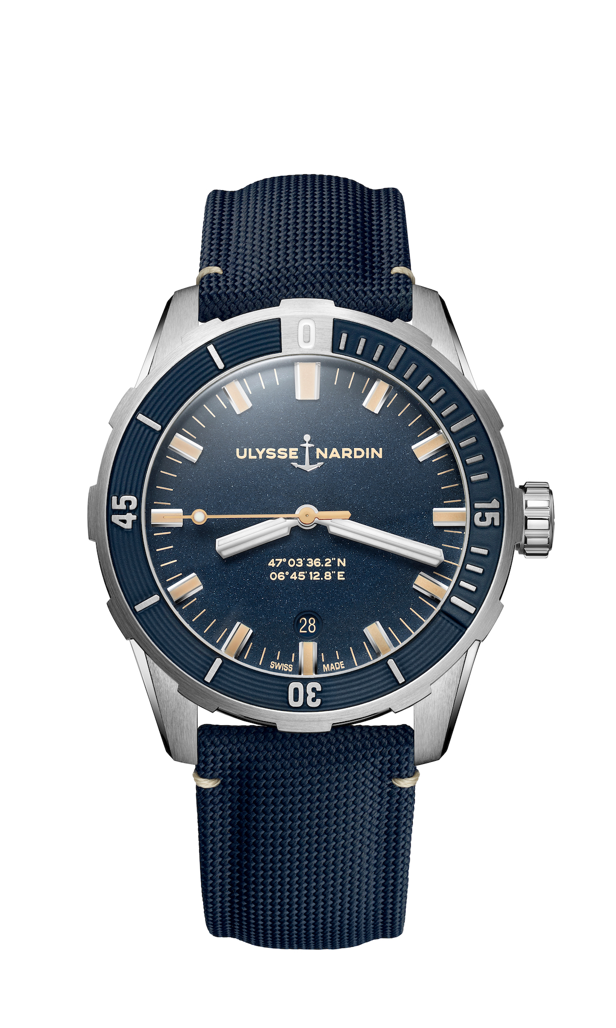 The new Diver watches are available on a leather strap, with a three-row stainless steel bracelet, or — for the first time ever for Ulysse Nardin — on a fantastic Milanese mesh bracelet. Inspired by the brand’s 1964 Diver Le Locle dive watch, the new 42mm Diver features a concave bezel and domed sapphire crystal, and have a vintage appeal with a clean dial, beige accents, and a central second hand instead of a small second counter. Also on the dial are the GPS coordinates of Le Locle, Switzerland — Ulysse Nardin’s home town.