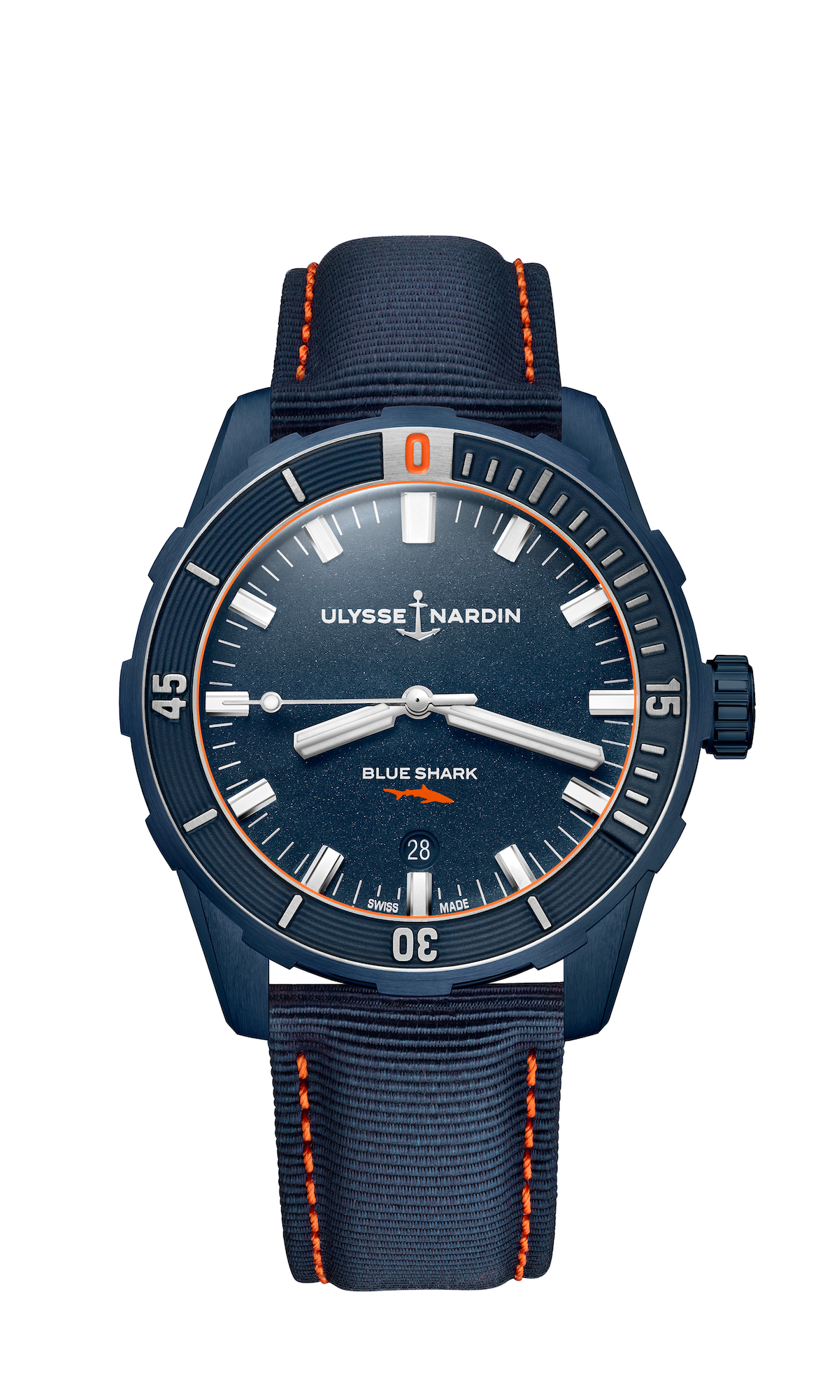 Naturally, the watch is equipped with all the essential diver codes: Superluminova on the hands, unidirectional rotating bezel and water resistance to 300 meters. The watch is powered by the UN-816 mechanical self-winding movement made in-house by the brand. It is equipped with silicon technology, and offers 42 hours of power reserve. There are seven versions the watch with either black or blue dial, but the star of the series is the Diver Blue Shark Limited Edition watch in steel with a blue PVD bezel, blue dial with orange accents and blue shark stampede note casebook. Just 300 pieces of this watch will be made. The Ulysse Nardin Diver 42mm timepieces range in price from 5,800 Euro to 6,500 Euro, with the BlueShark selling for 6,800 Euro.