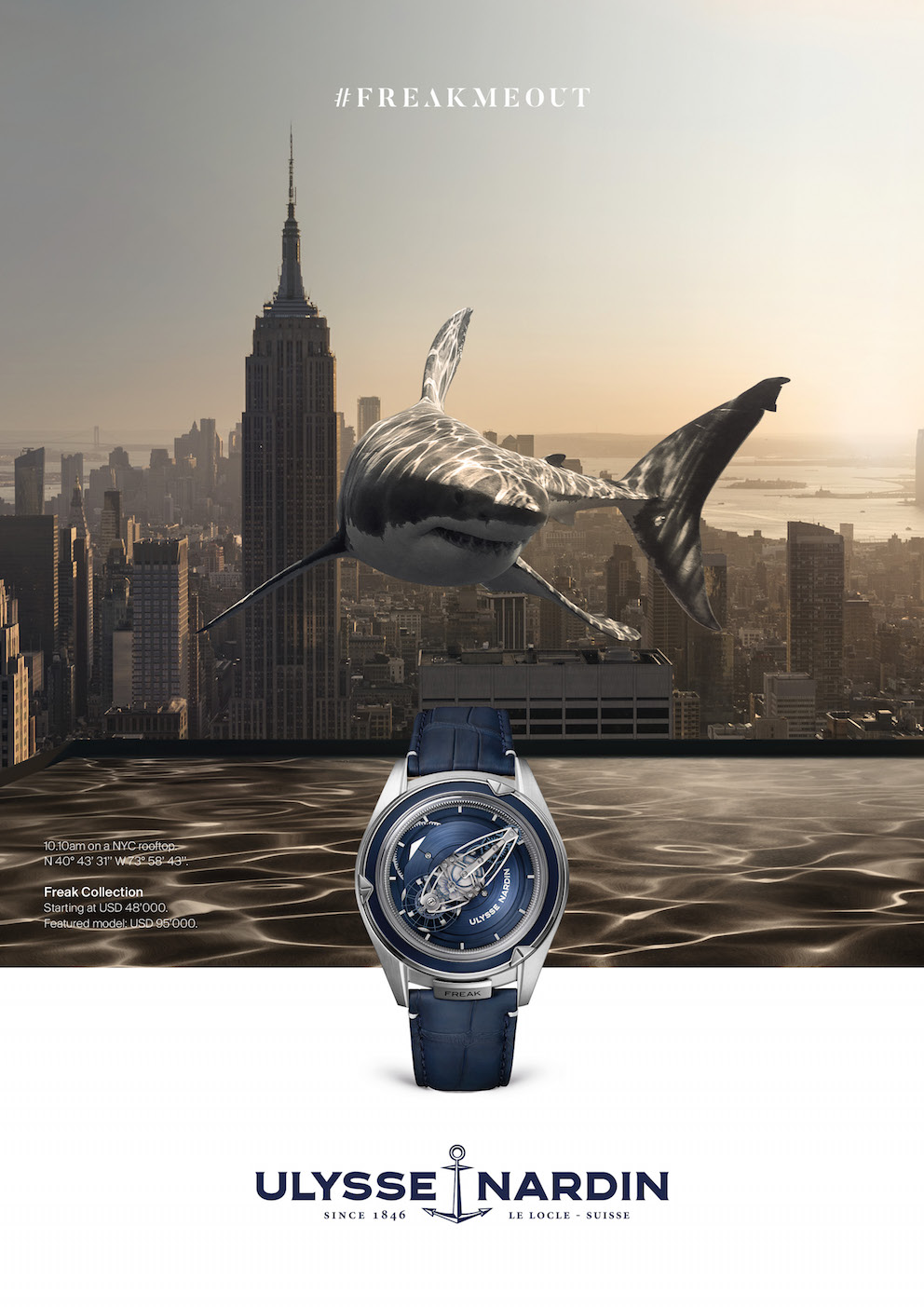 It’s here. The all-new Ulysse Nardin #Freakmeout ad campaign for digital and print makes its appearance this month worldwide. We recently wrote about the new campaign on our Perfect Timing column on Forbes.com. Now we bring you a close-up look at the wild and wonderful cutting-edge campaign that has sharks swimming through Manhattan and more.