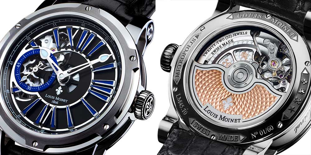 The case size is a contemporary 43.2 mm and consists of 55 parts. As mentioned, the case is the brand’s new Neo, and is water resistant to 50 meters. The watch is presented on a crocodile strap that comes with a folding clasp decorated with yet another Louis Moinet symbol, the Fleur de Lys. Metropolis will be available in two initial limited editions of 60, in steel and 18K rose gold, with prices starting at CHF 10,500 for steel and 29,500 CHF for gold.