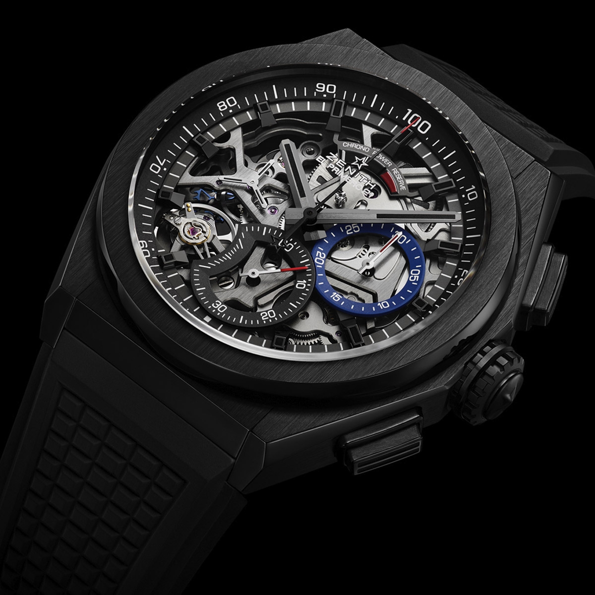 Our other favorite is the Zenith Defy El Primero 21 Black — crafted in a 44mm black ceramic case. A stealth statement, the black version is offered with a sleek black ceramic bracelet ($15,100), or with a black rubber strap ($12,200). This model has a very different look than the blue one, almost a bit more avant grade and mysterious at the same time.