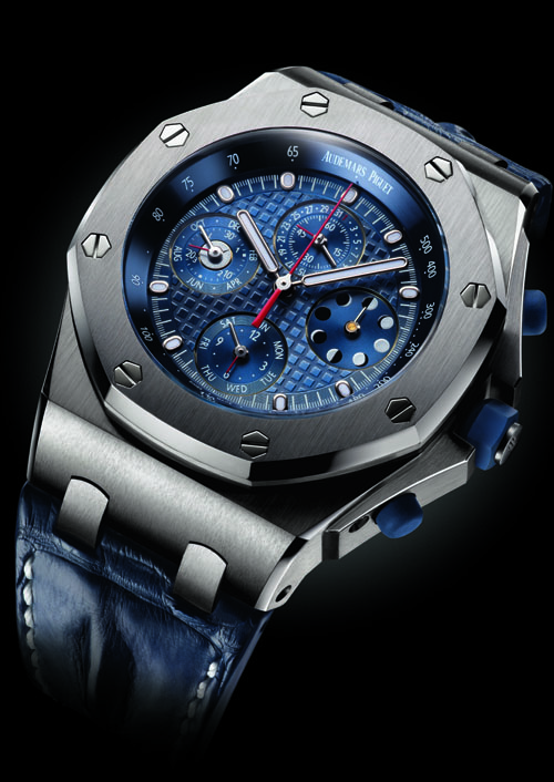 Taking a closer look at powerful timepieces, our top pick this week is the Royal Oak Offshore Chronograph Perpetual Calendar by Audemars Piguet. This bold watch packs a punch in design, functions and feel. This distinctive watch is impressive in all three of its renditions: platinum with
