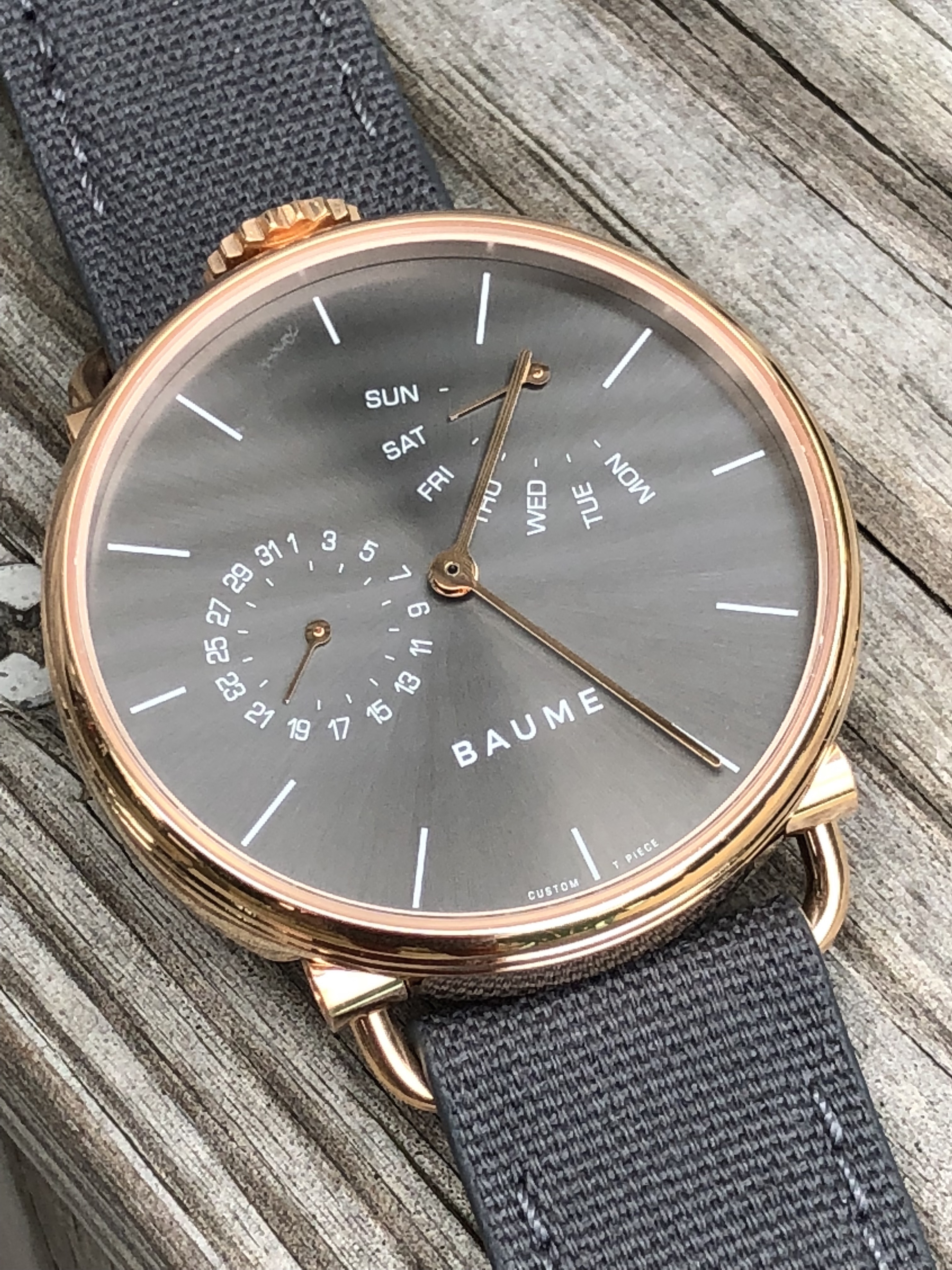 As mentioned, I selected the 41mm day/date watch in PVD rose gold color with date subdial and retrograde day indication. I opted for a slate gray colored dial with white markers and accent colors and rose gold colored hands. I naturally also opted for a rose gold colored buckle. The strap choice was gray to integrate seamlessly with the dial, although I did want white, it was not really available in true white when I was ordering (it has since been added to the selection). The nice thing is the straps are interchangeable, so I can now buy the white strap I like and change them off at will.