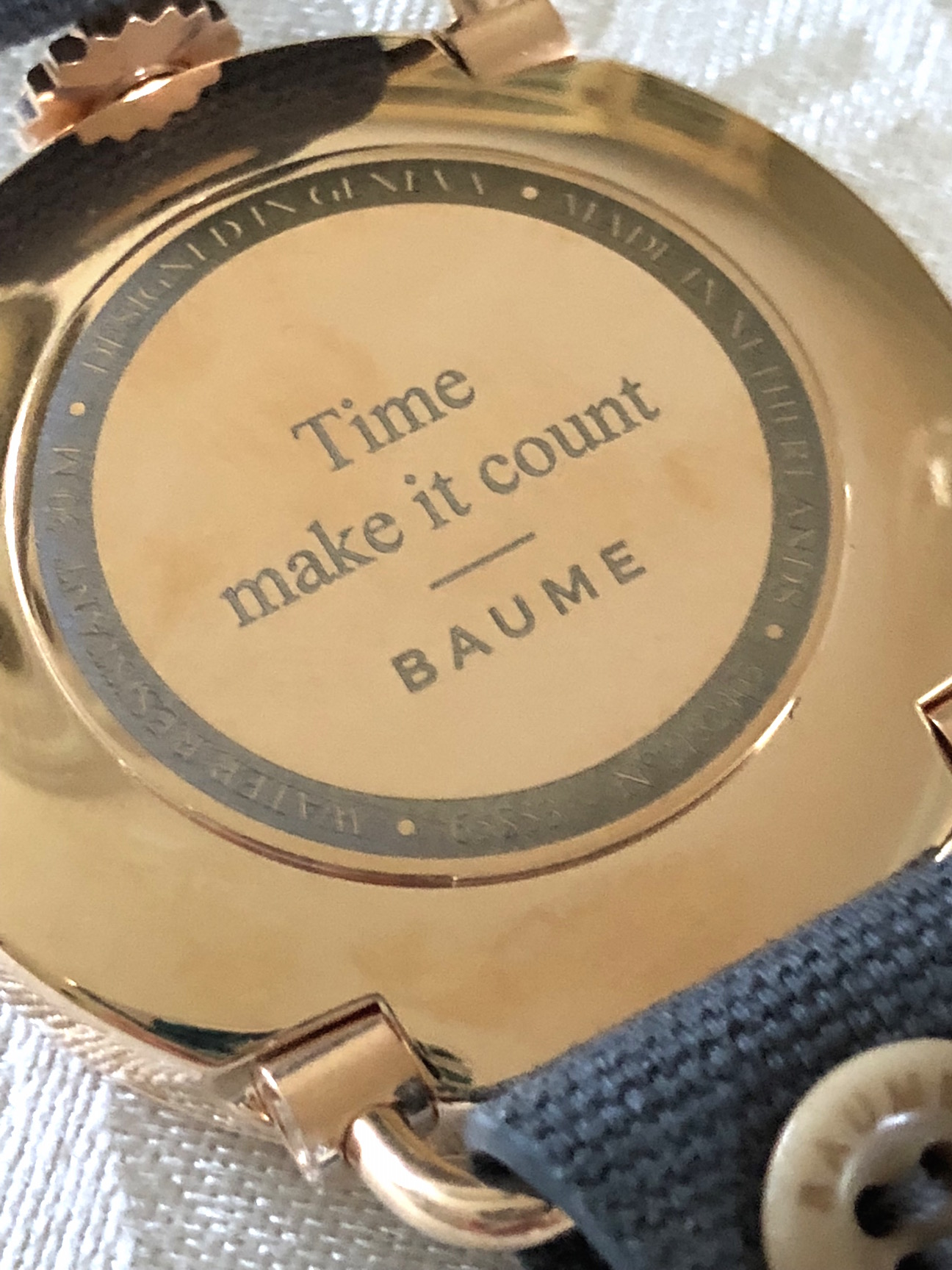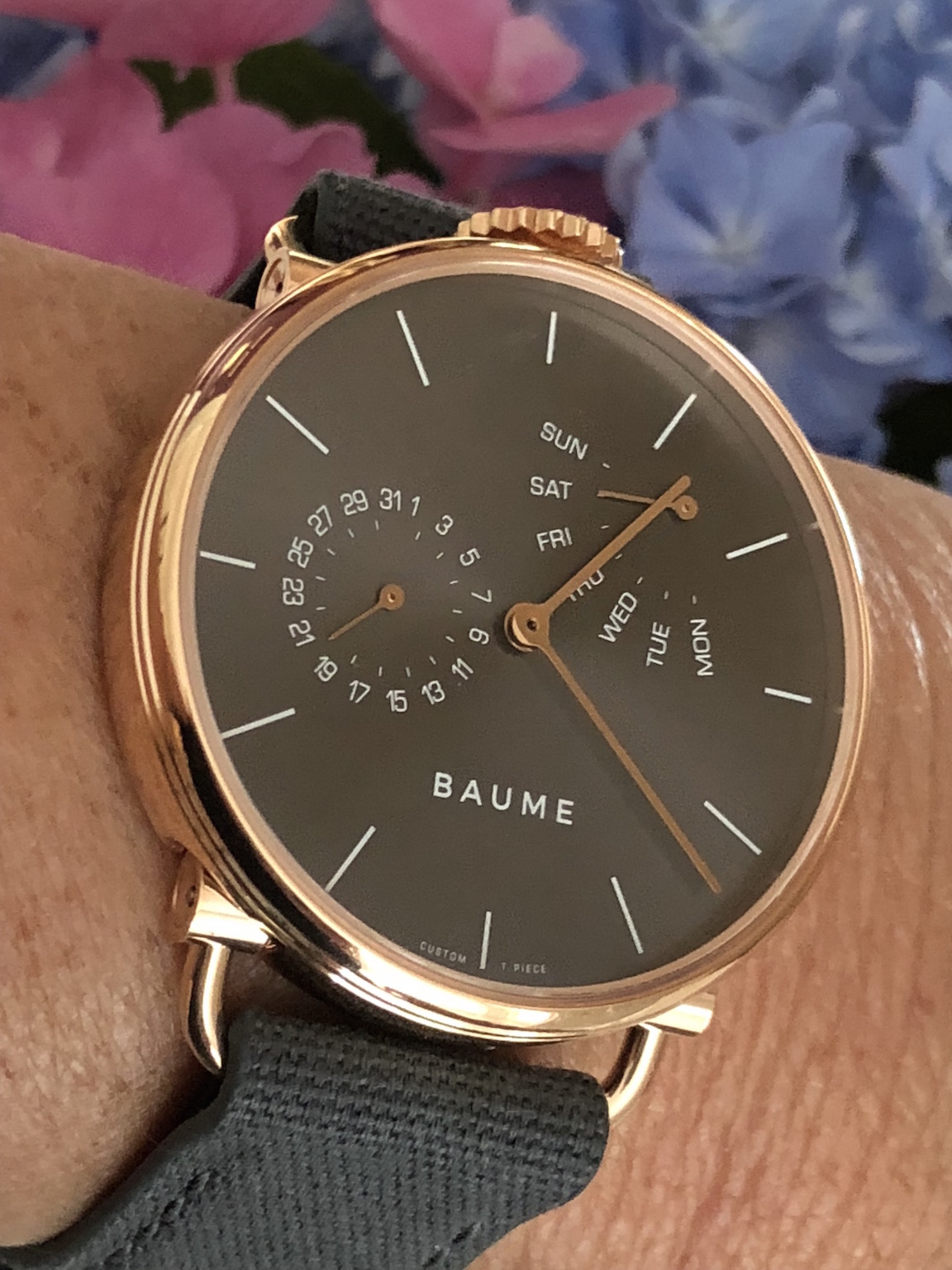 I elected to build my own watch, and scrolled through to find the watch I wanted: a 41mm day/date calendar watch with retrograde day of the week indication. The choices if you start from scratch include the retrograde I built or a small seconds option. (If you opt for an already responsibly made Baume watch, there is the choice of a 35mm a moon phase choice — and that one is a beauty.) With the model selected, I then got to select my dial color and the color of the numerals/markers, as well as the case finish and the strap. All Baume watches are sustainable with case materials that include aluminum, steel and PVD steel. The straps are made from natural materials including cotton, cork and linen. Sadly, when I created my watch, there was no option for a white strap, so I selected gray. Just this past week I learned that the company has added white to the strap color choices. One other very nice feature about ordering my watch was that I was able to further personalize it with an engraving on the case back. The process was quick and easy, and I knew I was getting something I semi-designed.